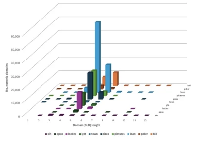 As a follow-up piece of analysis, even considering just a direct visual inspection of the raw domain data in the zone files of the highest-threat TLDs (as given in the Spamhaus study), some trends are immediately apparent: the domains across the TLDs in question appear to include disproportionately high numbers of numeric domains[12] (i.e. where the SLD – or second-level domain name; the part to the left of the dot – contains digits only), perhaps indicating a popularity of such domains for infringing use; and the .xin file indeed does appear to contain large numbers of ‘com-’ examples, but also in addition to ‘us-’ domains, which may have a similar potential use-case (i.e. constructing URLs resembling legitimate domains on the .us domain extension).