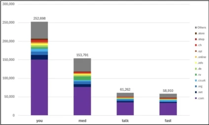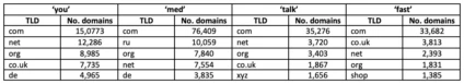 Some trends are immediately apparent, such as the apparent popularity of those terms most directly relevant to the English language (‘you’, ‘talk’ and ‘fast’) with the UK market in particular (as evidenced by the extensive use of .co.uk), and the potential relevance of ‘fast’ to e-commerce (given the frequency of use of the .shop extension).